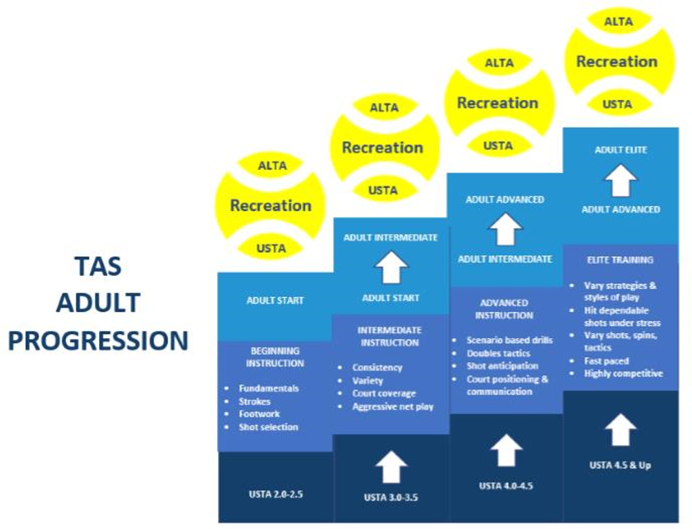 Our adult training progression provides a detailed road map for tennis specific goals at every interest and ability level. Adult players, with input from TAS pros, may set goals and chart their progress through a progression of instruction and training. We have the programming and methodology to take players through a logical progression of instruction to help meet their tennis aspirations.